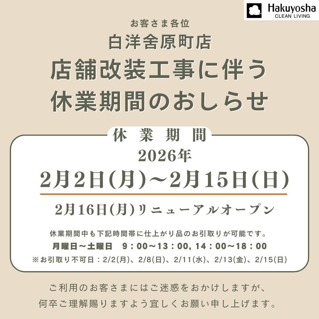 改装工事期間中も、下記時間帯はクリーニング仕上がり品のお引取りが可能です。